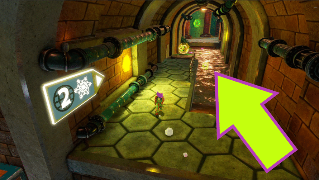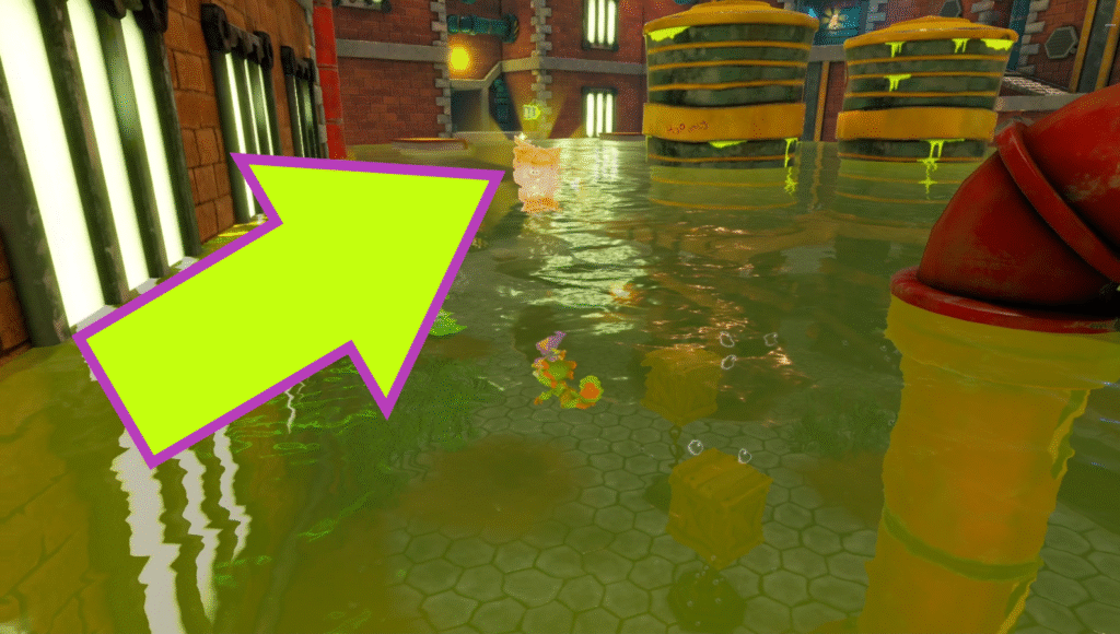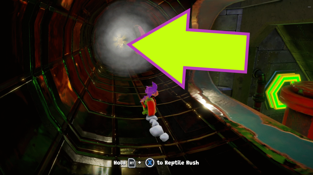 Jump across the gap and go to the right to find a chest that gives Yooka a force field. Use this to traverse the pipe to find a Pagie at the end.