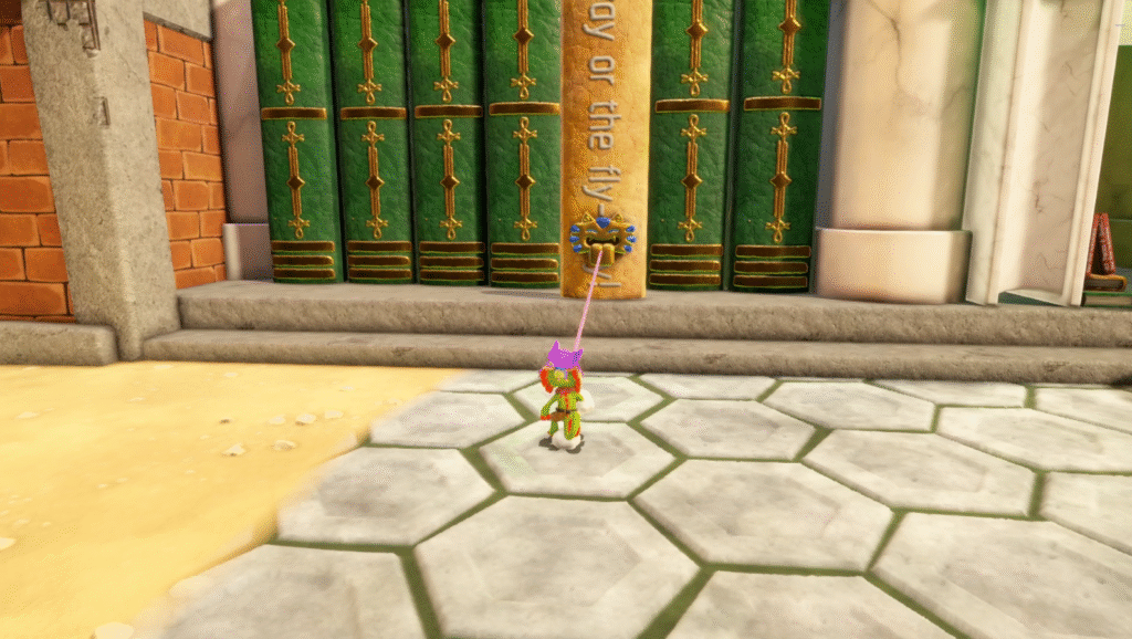Across a makeshift metal bridge are large green books with one beige book sticking out. Use Yooka’s tongue to grab and pull the book, revealing a Pagie in its place.