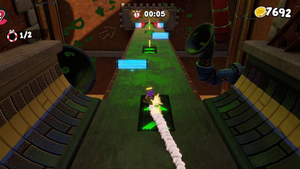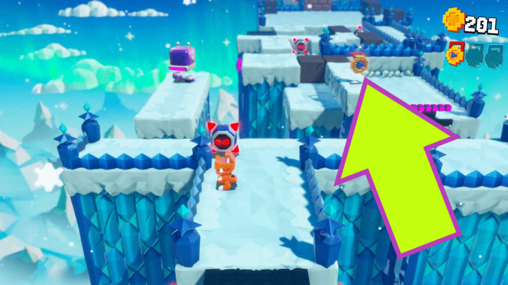 Continue through to the next area and jump up the hexagonal columns, and go through the doorway at the top. Complete the sliding challenge in the time limit to free a Pagie from its Cagie.