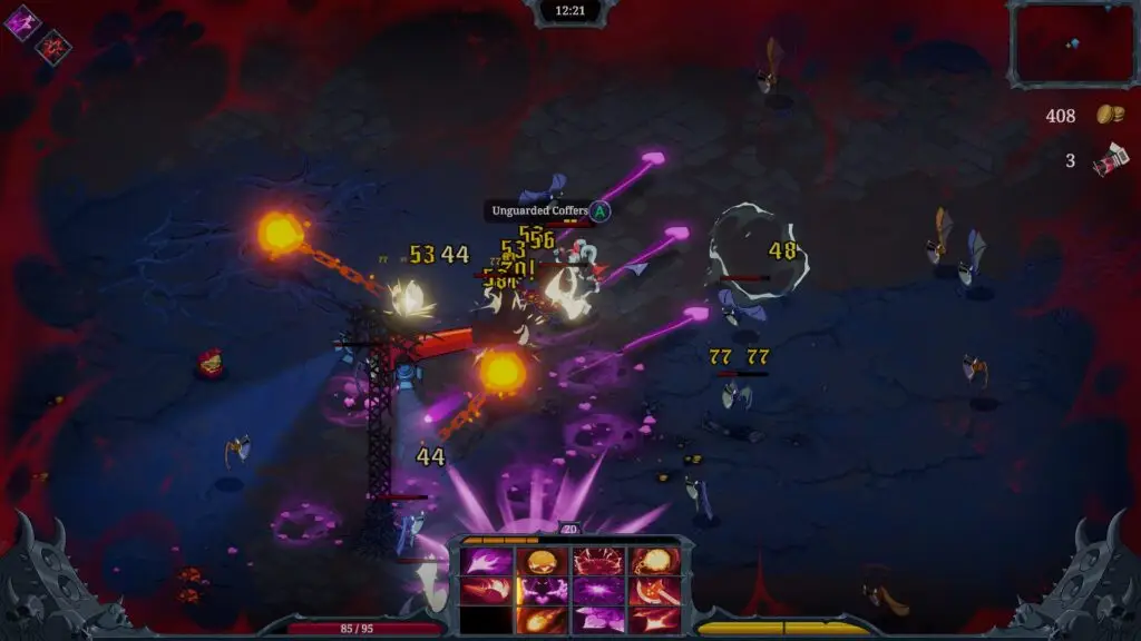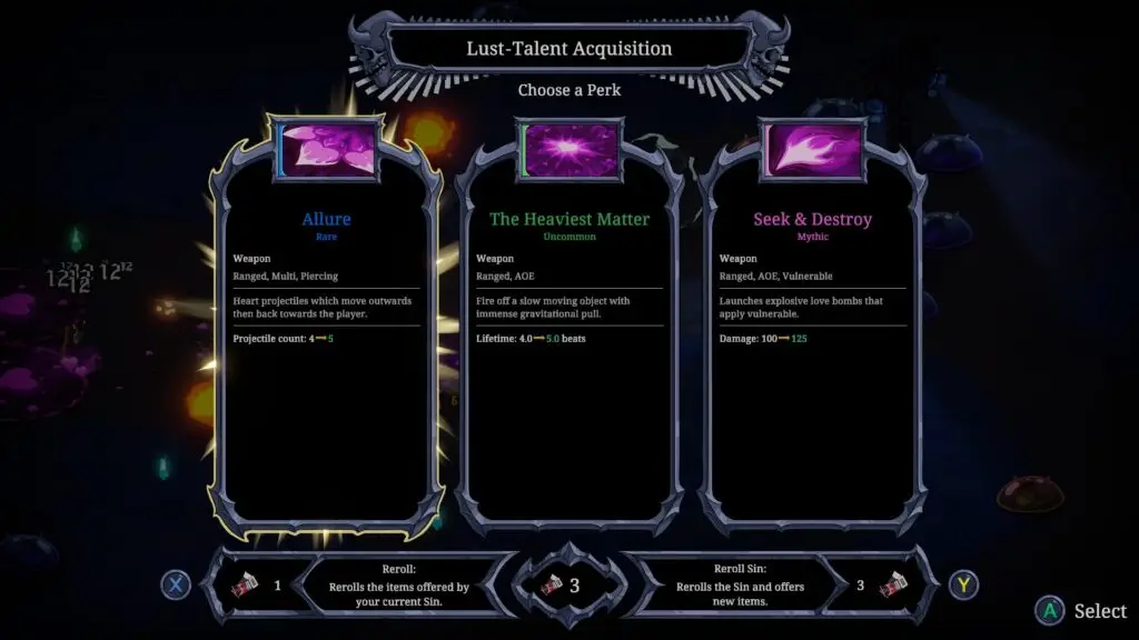 The 12-slot inventory system offers some customisation, but it’s easy to fall into ineffective builds due to unclear synergies and a lack of meaningful feedback. Choosing from different sins adds a layer of choice, but the restrictions on how many you can use per run feel more limiting than tactical. For example, buffs affect a specific pattern of squares on your grid, but you can’t move anything once you’ve placed it – so if you don’t find any good buffs that suit your attack placements early, you’re really going to struggle to build any significant damage. The attacks also lack any of the big powerful upgrade moments you’d expect from a game like this. You’ll get an extra projectile here and there, but one of the satisfying things about “Survivor” games is evolving a weapon of passive into something bigger and flashier.