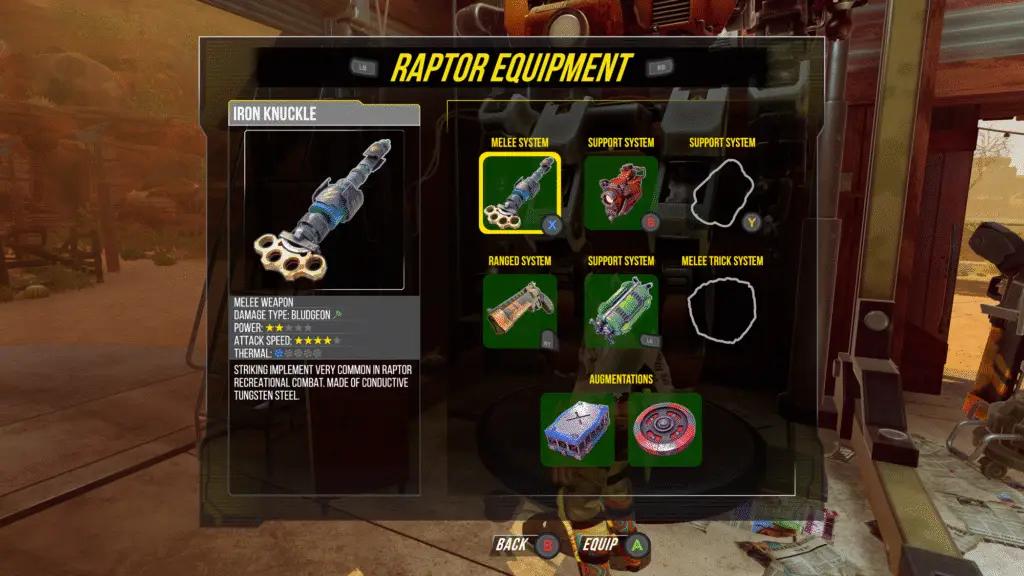 You will then need to head to your Raptor and equip the Iron Knuckles as your melee weapon. You should also have Dash Jets equipped in one of your support slots, but if you don’t equip them when going for this achievement.