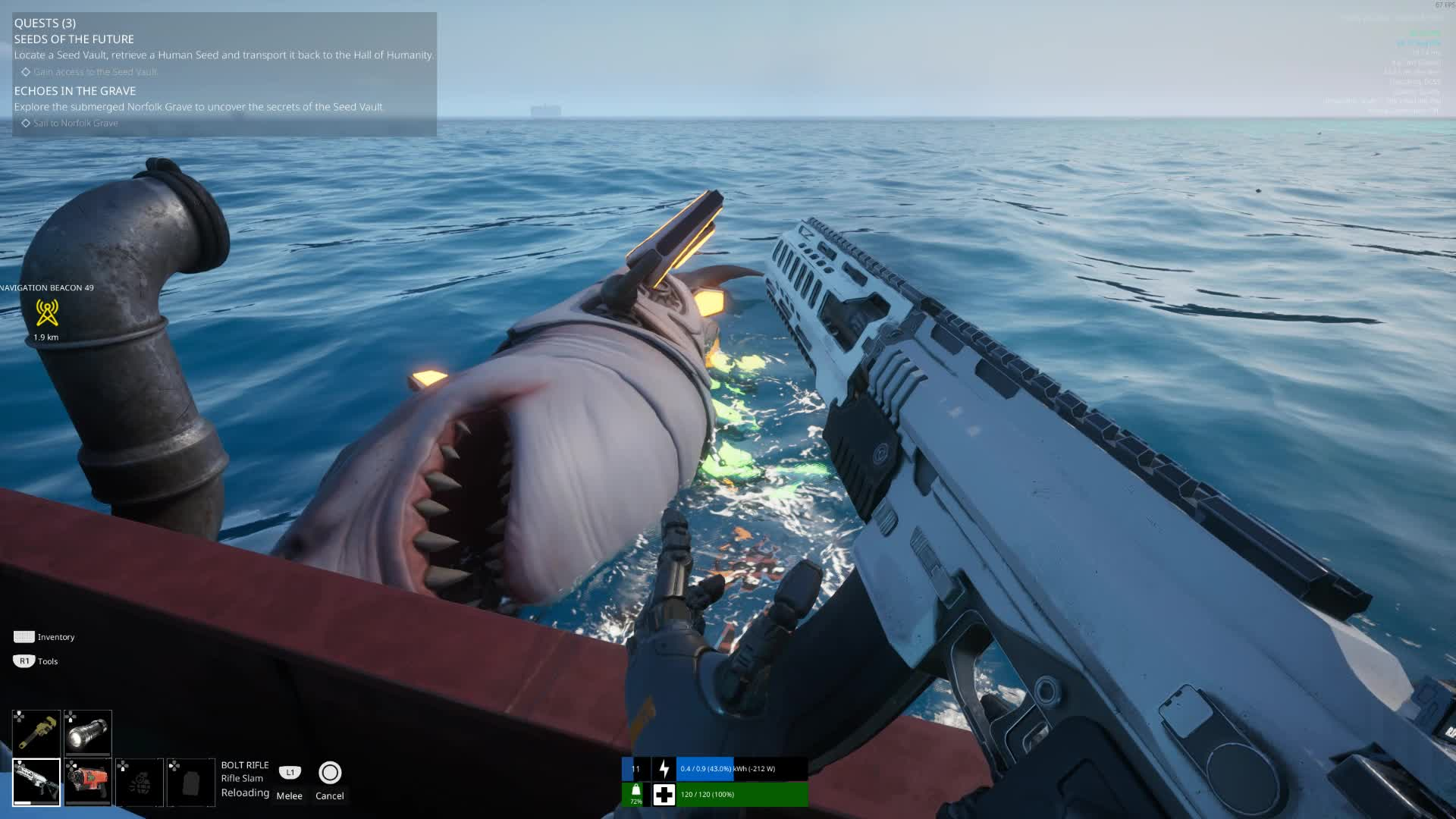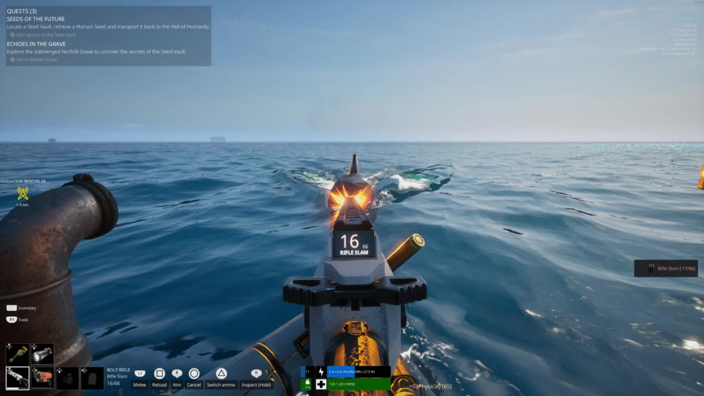 Lastly, The Last Caretaker does have a good bit of combat interweaved in with the intricate crafting and resource systems. While you might start off with only a crowbar as your only weapon, you quickly level up and are able to unlock a good variety of weapons from pistols, to flamethrowers and assault rifles each of which feels like a step up from the previous unlock. The varied amount of enemies you will be fighting range from harmless looking organic globs and smaller robots, to huge rolling sentries equipped with machines guns and relentless aggression. I’ll be blunt and say that the enemies do not play and getting chased down by any type of enemy will get your heart rate up in the most terrifying way possible. Oh, and I hope you don’t have a phobia of sharks because, well. Bruce from Jaws makes more than a few appearances throughout your journey and he is not a happy man. Overall, the combat is basic but more than enough to make most survival fans happy.