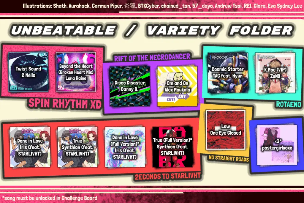 UNBEATABLE may have just a few achievements but will you really be stopping at just one song in the different arcade modes anyway? When UNBEATABLE comes out, players will have access to 12 songs from other artists/games. This is in addition to the soundtrack from the game.