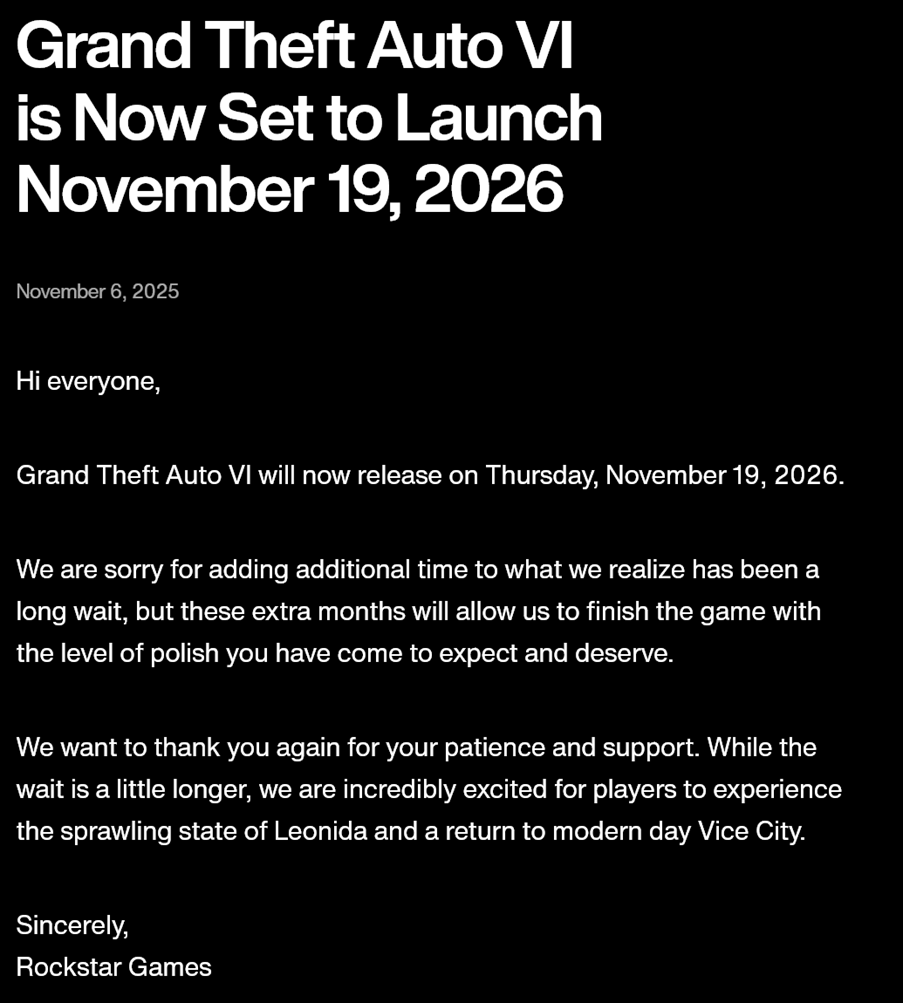 In a move that may surprise few gamers, Grand Theft Auto 6 has once again been delayed and will now launch on November 19 2026. Previously the release date had been scheduled for May 26 2026, which itself was an already delayed date.