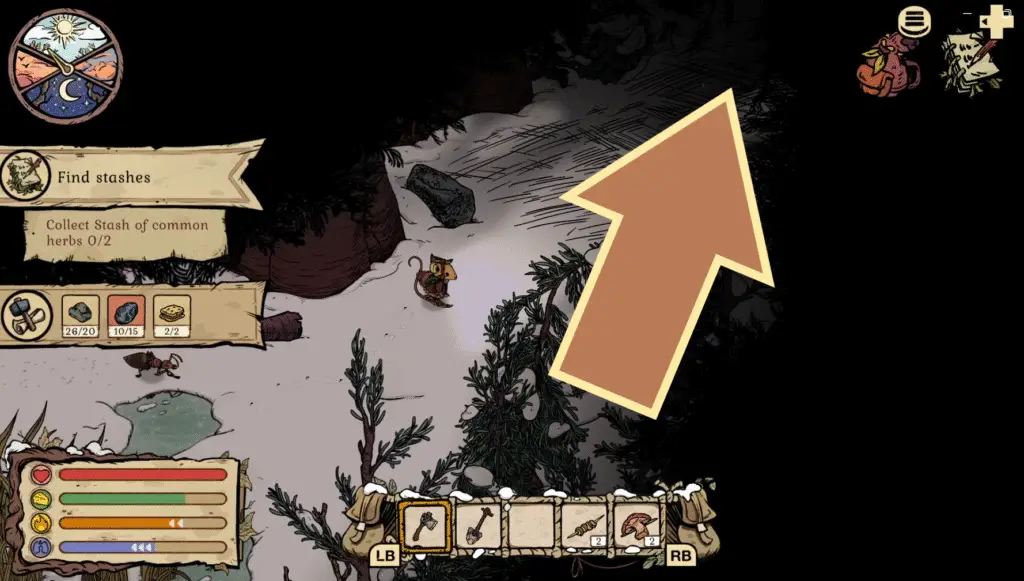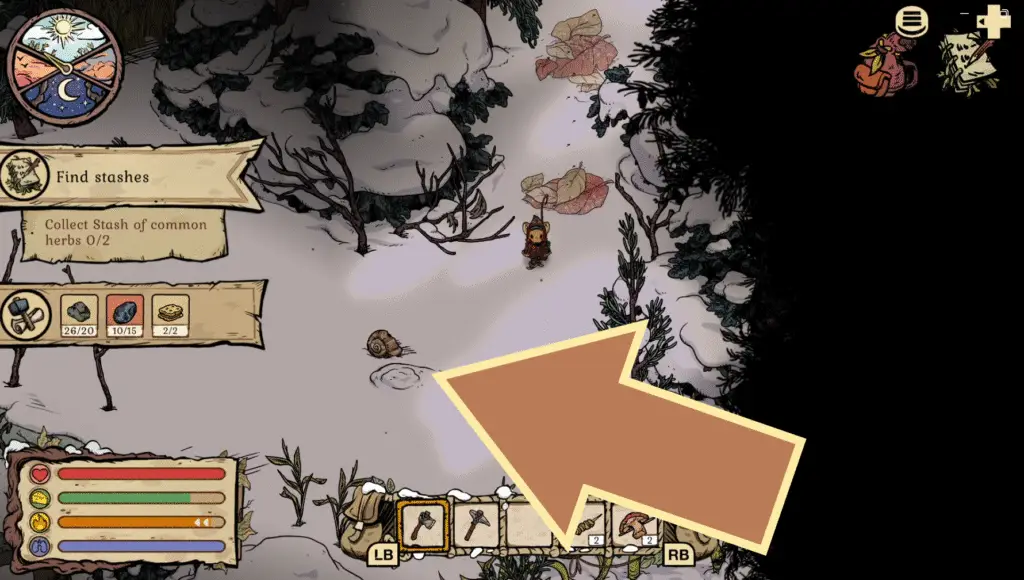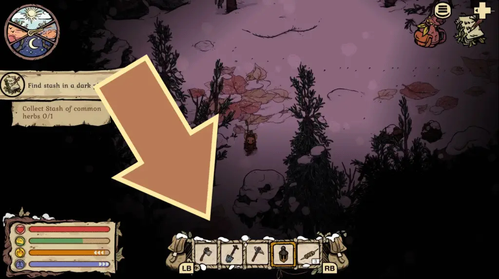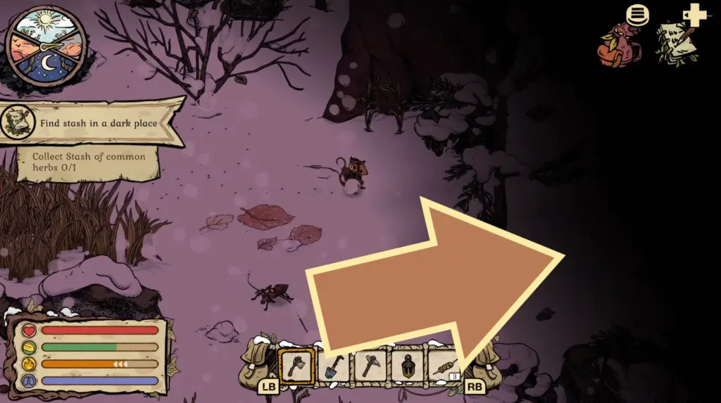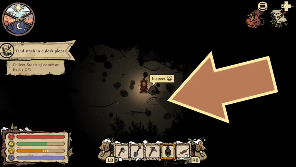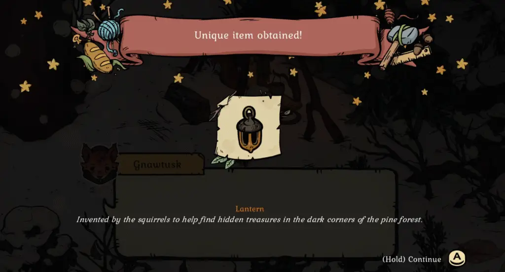 Go back to Gnawtusk, and they will remember a third stash they hid in a dark part of the Shadow Pines, so they give you a lantern you can equip to see in these dark spots. This is Gnawtusk’s next quest: Find Stash in a Dark Place.