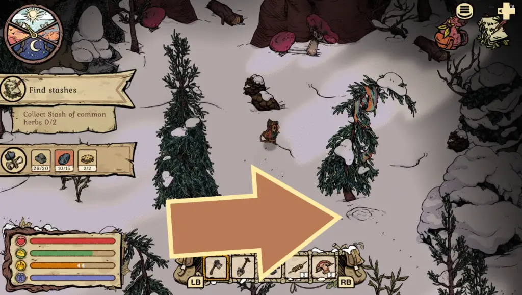 Go back to the first new area we you entered and take the exit on the right side to enter a new, larger area. There is a tree with a scarf draped over it, and at its base is the second dig spot with Gnawtusk’s second stash.