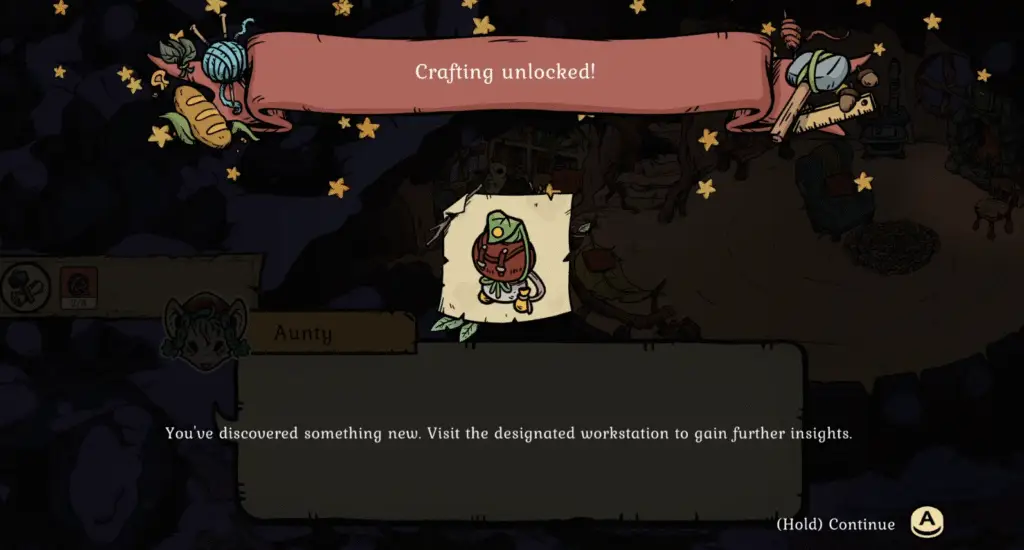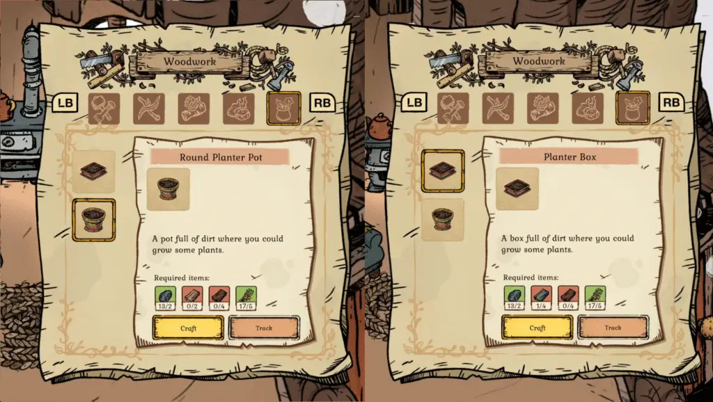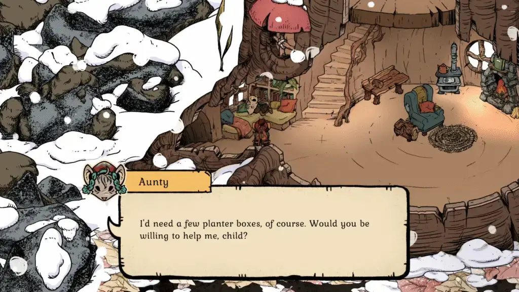 Again, head back and speak to Aunty, who is starting to feel better and able to help out at the burrow. She gives you the blueprints for two types of planters so she can grow herbs for you while you go out and about; what a coincidence, we can grow the herbs we need with these!