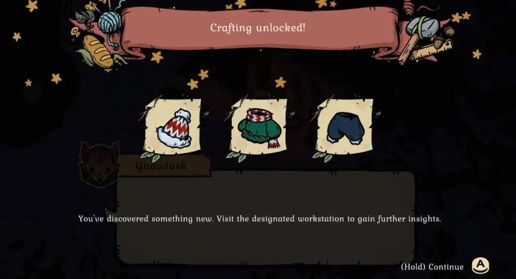 Return to Gnawtusk and be rewarded with blueprints for warmer clothing. Finishing this quest for Gnawtusk leads straight into a main story beat of the game, but before that plays out, you will get their next quest, Find a Stash of Rare Herbs.