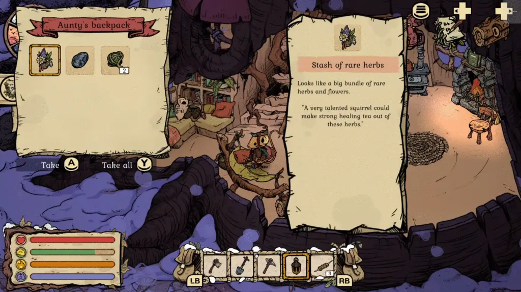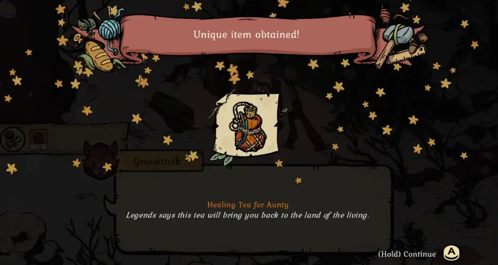 After the cutscene, you will be back at your burrow. Look in your Aunty’s backpack, which is on the floor, to find the stash of rare herbs we need. Return to Gnawtusk, and they will give you a unique item, Healing Tea for Aunty.
