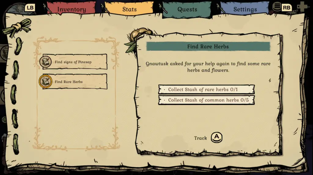 Head back to Gnawtusk, and they will give you their next quest, Find Rare Herbs, which needs you to find 5 stashes of common herbs and 1 stash of rare herbs.