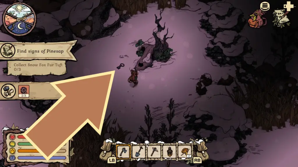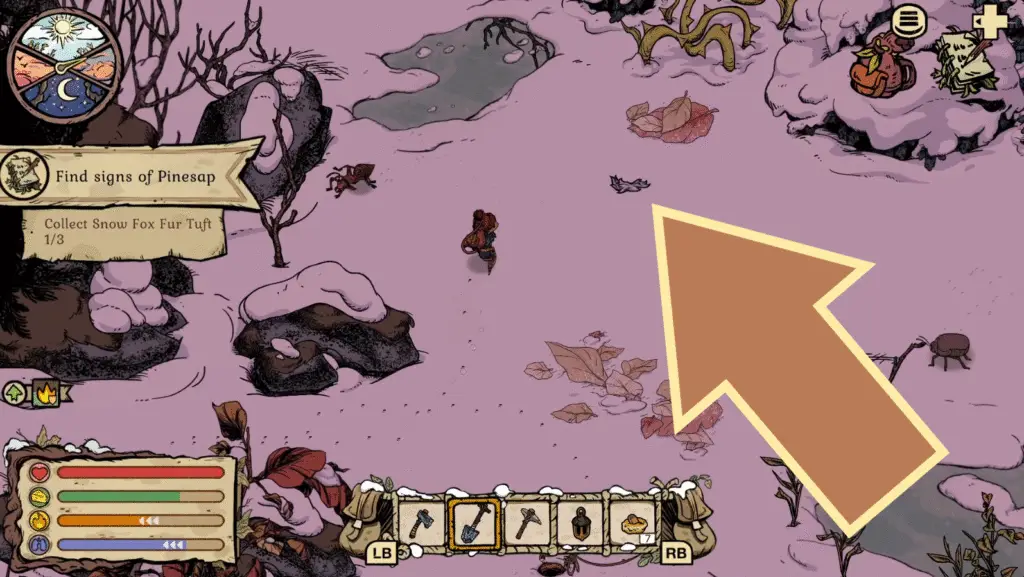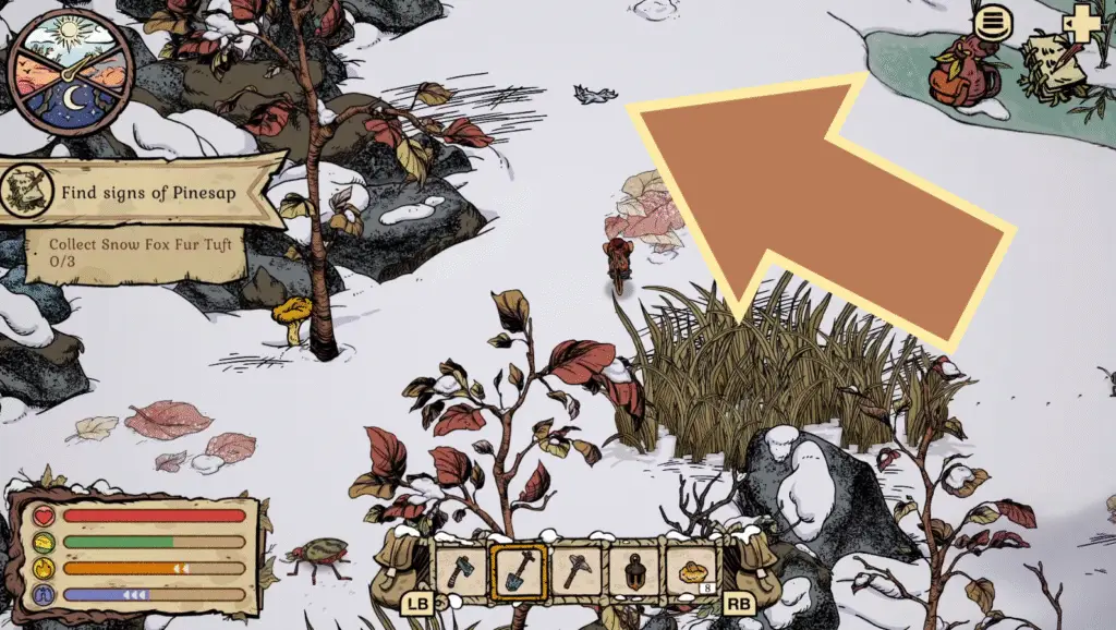 For their first quest, Find Signs of Pinesap, Moss wants you to find three 3 snow fox fur tufts. They can be found in the Shadow Pines region out in the open, but they can be hard to spot due to blending in with the snow.