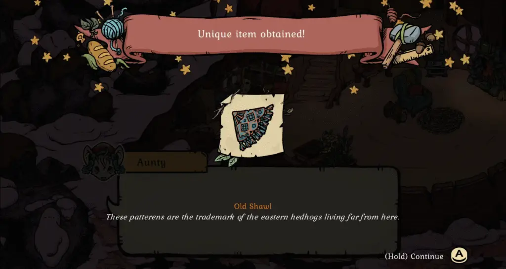 Aunty will feel stronger after having the mushroom stew and will give you the blueprint for the best axe, completing this quest. Be sure to craft the axe back at your burrow.