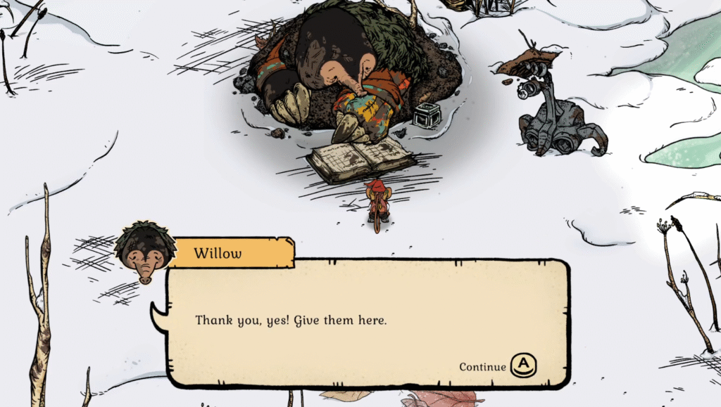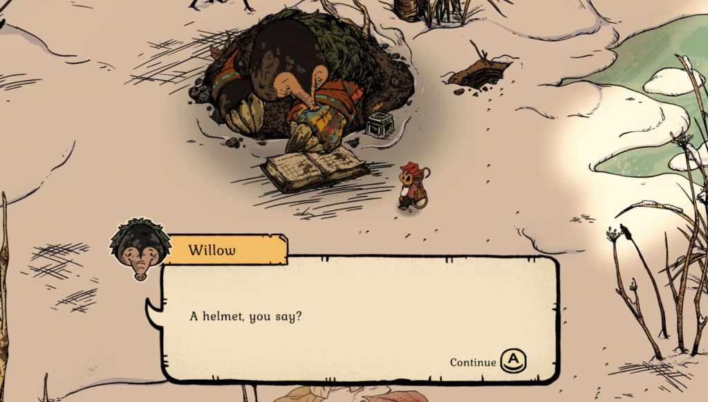 From the entrance of this new region, go straight down and enter another, larger area, then continue going down and to the left, looking for an exit going West. In this small dead end, you will find Willow the mole. For their first quest, Find Willow’s Notebook, you have to… well, I think you can work that out!