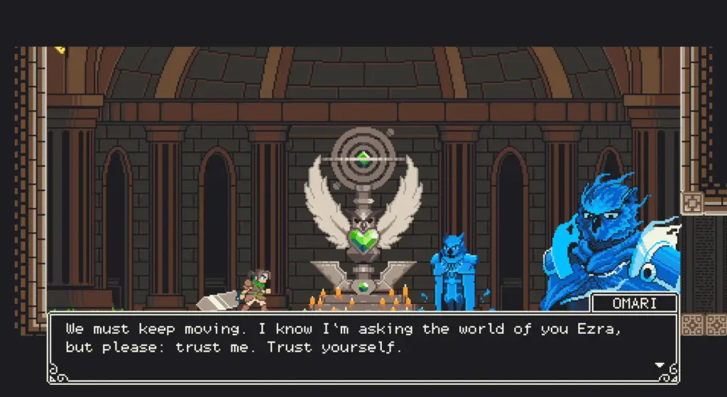 On the surface, GIGASWORD is a 2D sidescrolling metroidvania game that wears its inspirations proudly on its broad blade, but it is that same weapon that adds an incredible amount of depth to the game’s combat, traversal, exploration, and puzzlesolving. When you first take control of Ezra, he is quick, can jump high, grab onto ledges, swim, crawl through narrow spaces, and has a long dodge roll. He is nimble to control, with precise controls and immediate responses to your inputs. But, he is unarmed, unable to fight against enemies, break down or remove barriers, or interact with certain objects and mechanisms within the Nestrium. This all changes the moment he picks up Omari’s GIGASWORD.