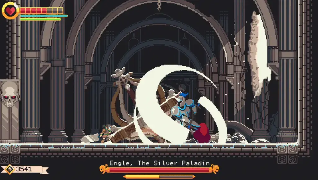 It is this dual gameplay structure that is at the core of GIGASWORD’s design, and the way that it has been integrated into every facet of the game is nothing short of incredible. You are challenged, not just in how good you are at fighting and platforming, but in how you apply your wits in every situation. With nearly the entirety of the game taking place within the home of the Nocturne, all of whom seemed to have blades like the one Ezra now wields, it makes sense that so much would hinge on using it to get around. Throughout my playthrough, I kept having little “aha” moments, sudden revelations of what I could always do but hadn’t yet thought to try.