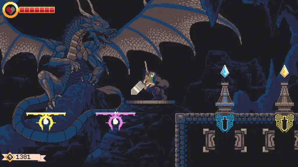 The majority of GIGASWORD’s pixel art is stunning, with highlights being many of the epic backgrounds you’ll see scrolling by as you explore, as well as the enemy and boss designs, all of which stand out and feel different enough from the usual slate of creatures. The world of GIGASWORD is alive with colour, despite being almost entirely concealed within the Nestrium. Each floor of the Nestrium has a style and colour palette, giving each its own identity and sense of place. The dank waterways at the base of the tower are a mix of deep blues and greens, with nature still finding a way to creep in between the chiseled stone, while the Lunarium feels like you are floating in space, so high up and far removed, surrounded by unfamiliar, austere architecture. Giant statues of Nocturnes brandishing their signature weapon can be found throughout, while others depict moments from their history and prophecies.