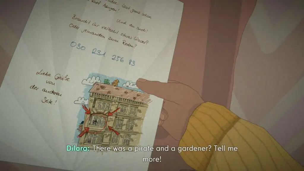 The first story is simple, optimistic, and even a bit brave. This is also where our perspective changes and we travel back in time to 1989. We are no longer Dilara, we are Kolja, a man who loves his plants but doesn’t seem to love his life. We awaken on the floor, our roommate has left, and Kolja is not quite sure what comes next. That is until a paper airplane makes its way through the window. From here an unlikely friendship begins to take shape. Separated by the wall that splits Berlin, Kolja befriends an artist named Lu.