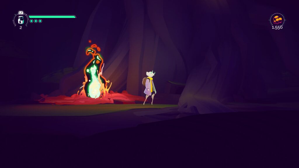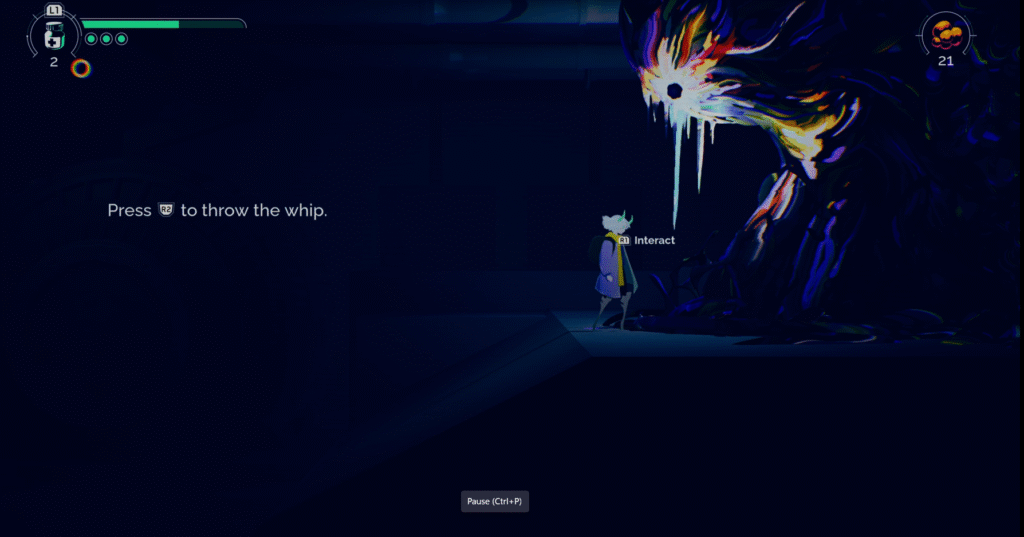 - Whip – the first ability you find, very early in the game. This lets you grab grapple points to swing across gaps and to ledges. It also lets you grab enemies, and move large objects. Most importantly, and something it doesn’t tell you, you can use it to grab sections of walls that have a crack in them, indicated by an orange glowing crack. The wall grabbing is only on vertical, full walls. I spent way too long not knowing this, hindering my progress.