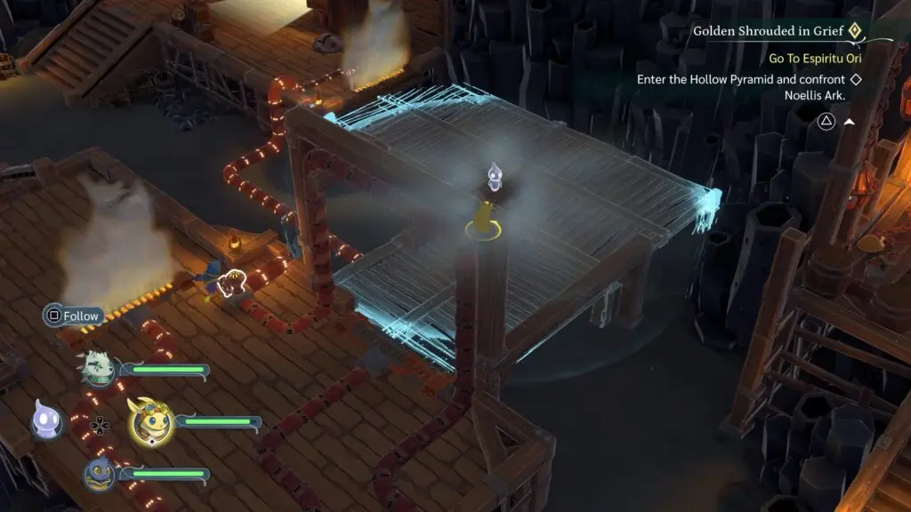 Take one party member, along with Ghost, towards the bottom right corner platform, crossing the bridge that appears. To cross this steam barricade, interact with the bottom right valve with one of the other characters you left on the middle platform.