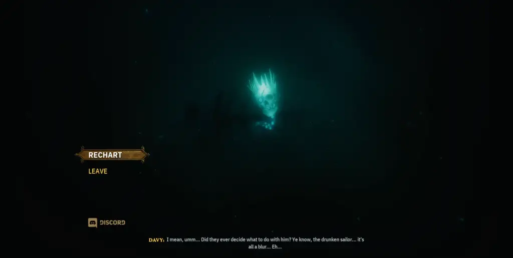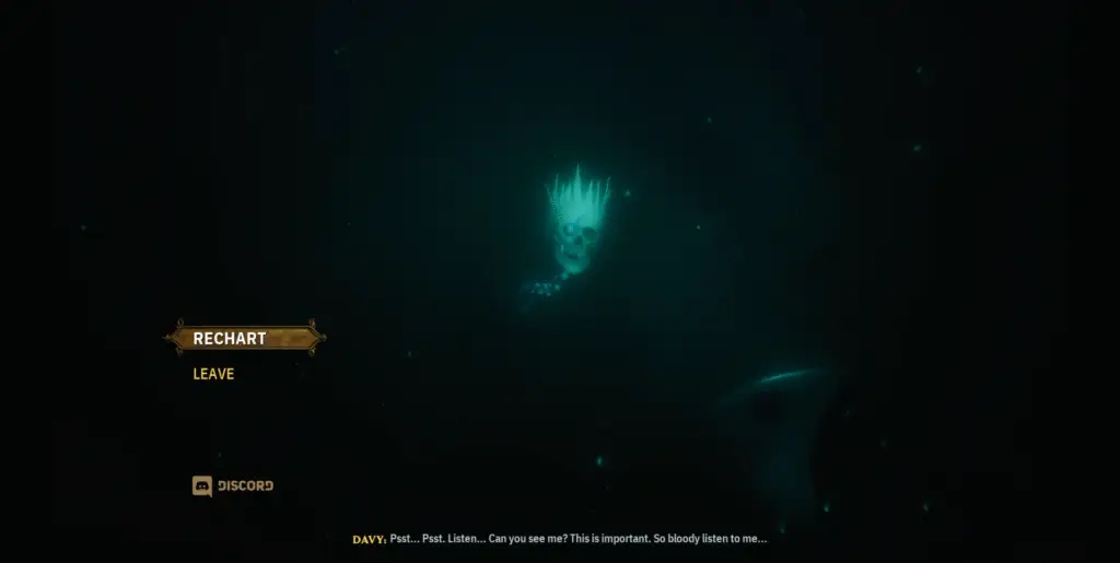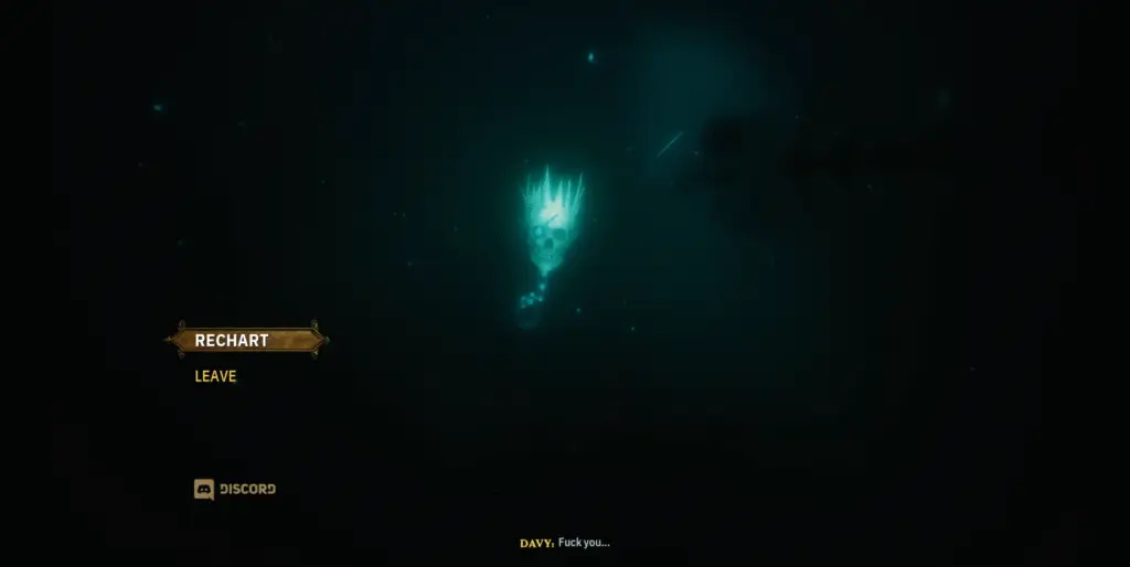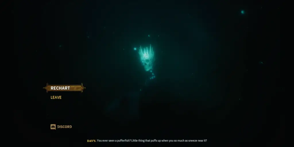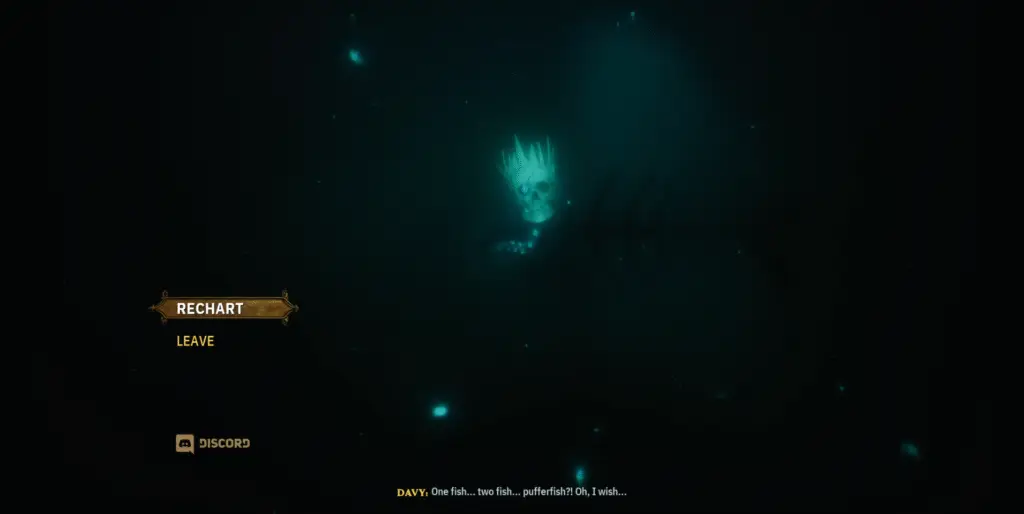 Once you have met your grisly end, you’ll be taken to a death screen with the options to Rechart (Continue) or Leave (Quit). In the centre of the screen floats an illuminated Davy, with the occasional fish skeleton catching the light as they swim past him.
