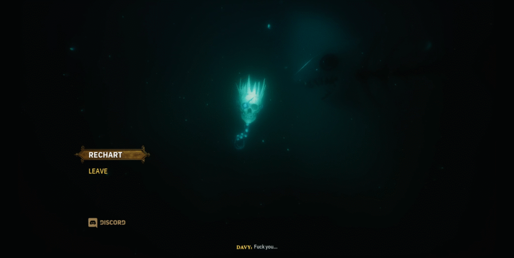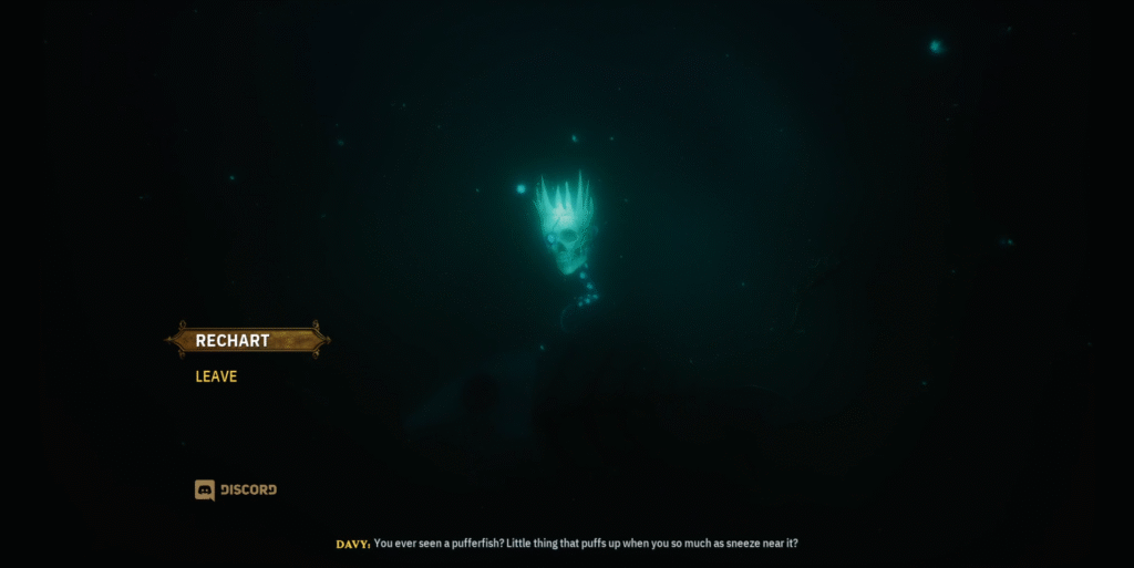 Once you have met your grisly end, you’ll be taken to a death screen with the options to Rechart (Continue) or Leave (Quit). In the centre of the screen floats an illuminated Davy, with the occasional fish skeleton catching the light as they swim past him.