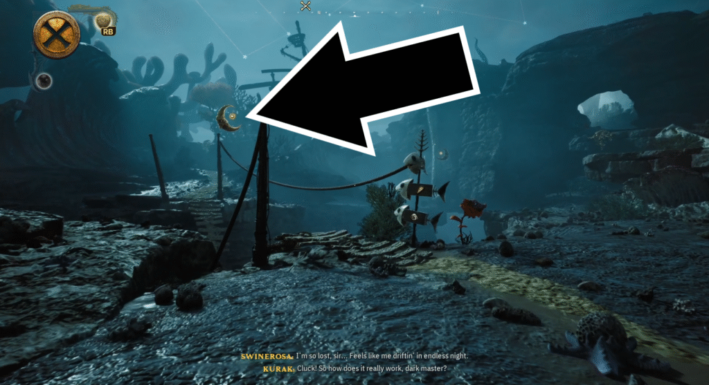 Above the save point is a Moon hookshot point on the edge of a raised rock. Use it and then use a second one immediately above you. Look for a third moon on a porthole of the shipwreck.