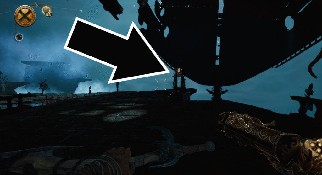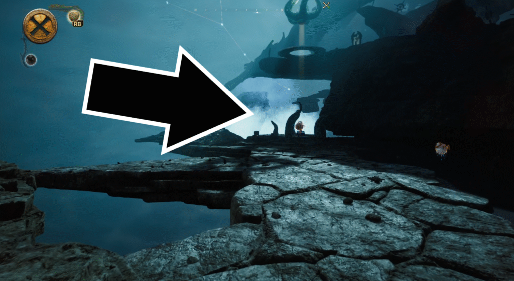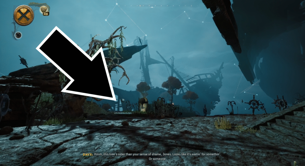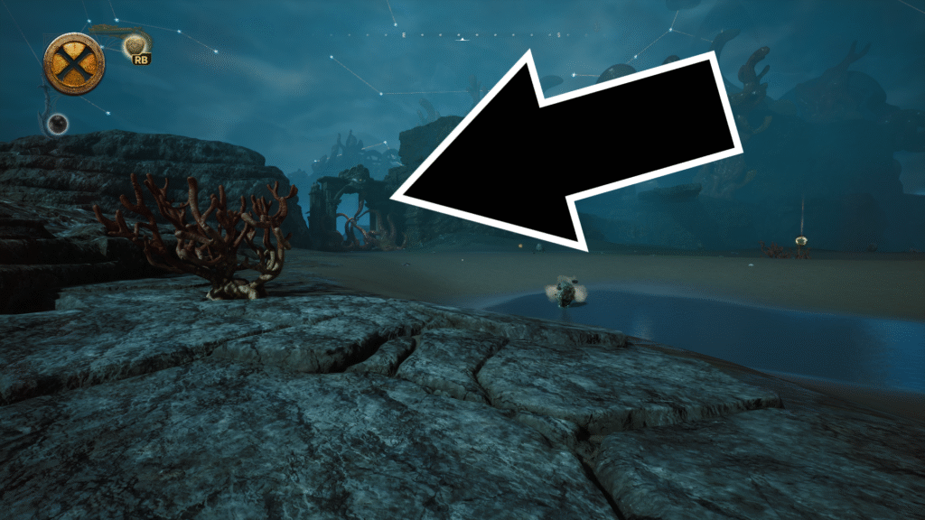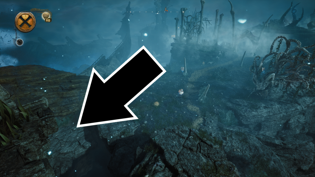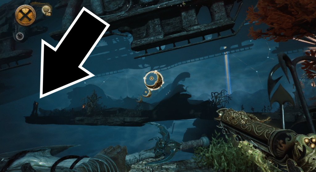 From the last guillotine, hug the northern edge of the island and head East to get to the front end of the longer shipwreck. When you reach a large statue covered in bioluminous seaweed, look for some floating Moons leading to a small island on your left.