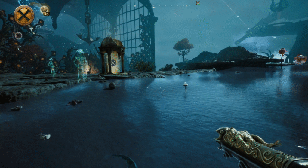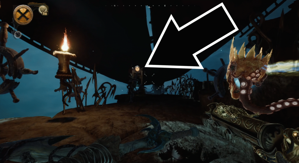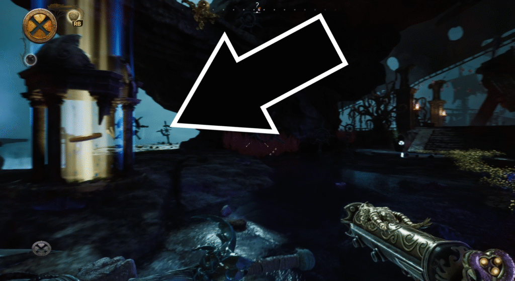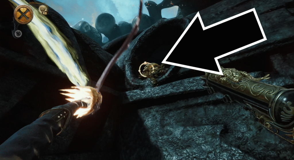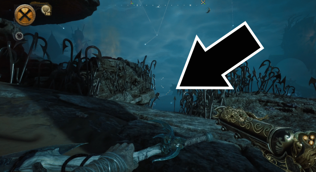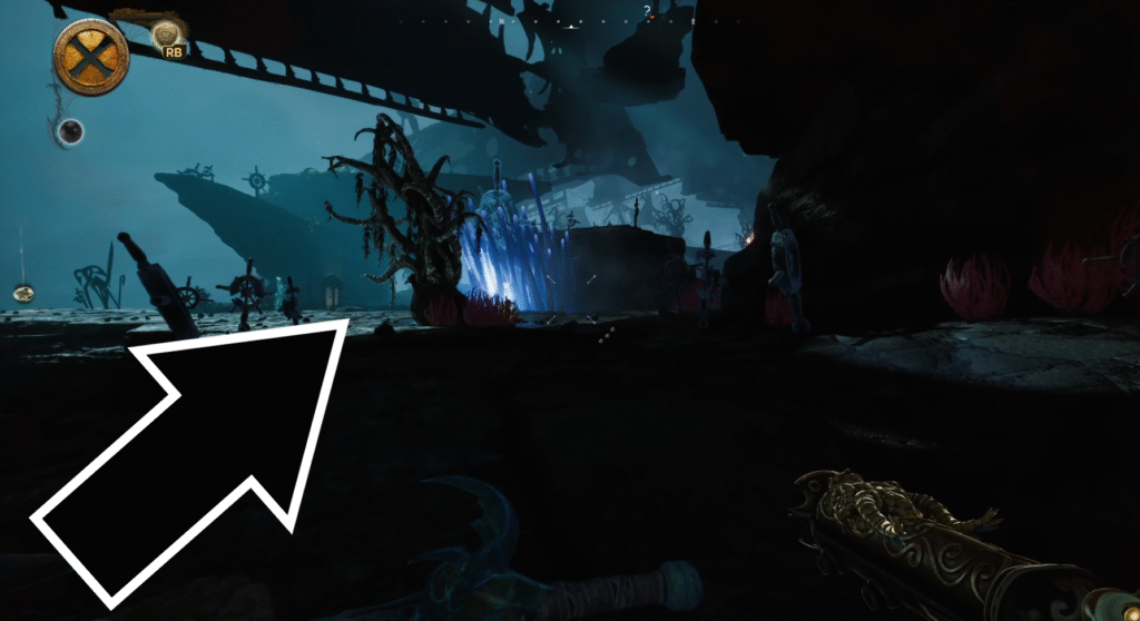 From the last guillotine, hug the northern edge of the island and head East to get to the front end of the longer shipwreck. When you reach a large statue covered in bioluminous seaweed, look for some floating Moons leading to a small island on your left.