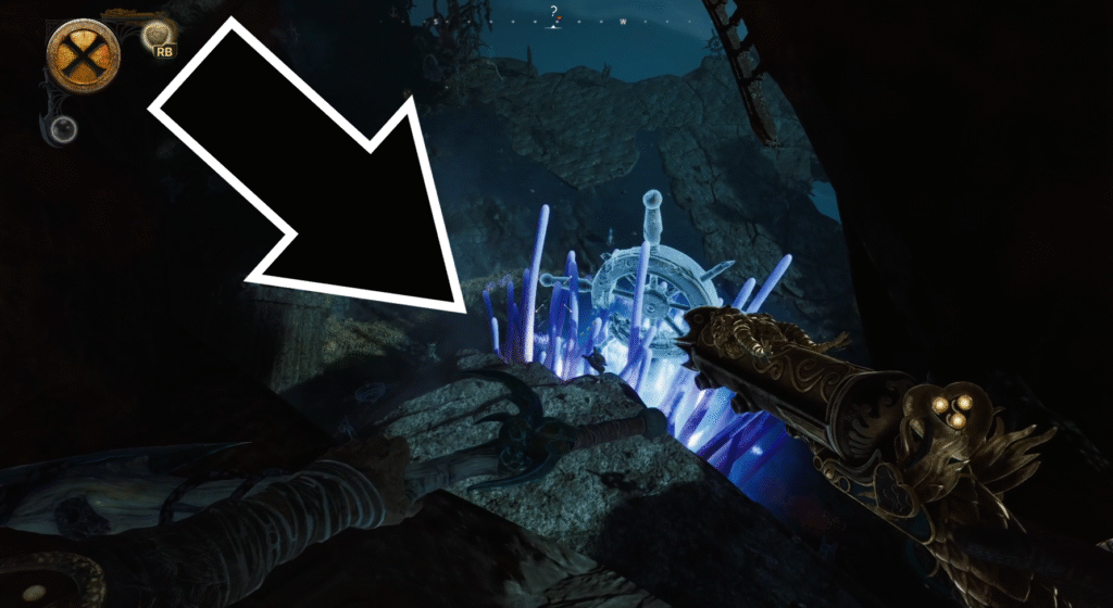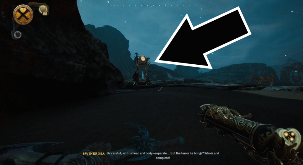Exit the Singrove and go to your left, where you will find a lift operated by a Barrelman. Take it up and go to your left again towards a quick save point.