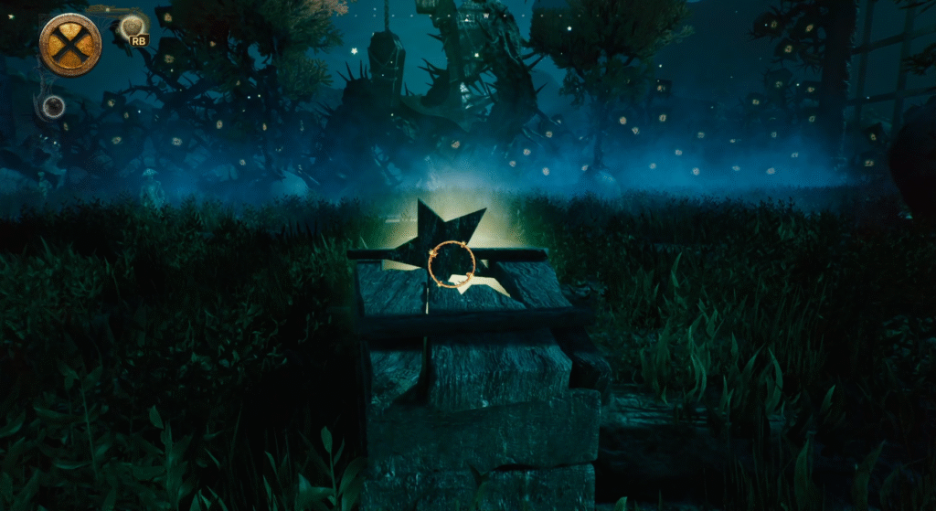 Facing the back of the Singrove, look for a ghost hovering over a guillotine to the right. Interact with it and choose to free the spirit or seal their fate. Either way, you are awarded with some treasure and a bright blue Star!