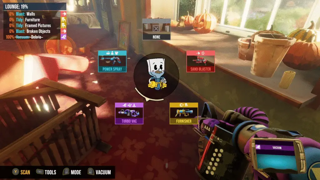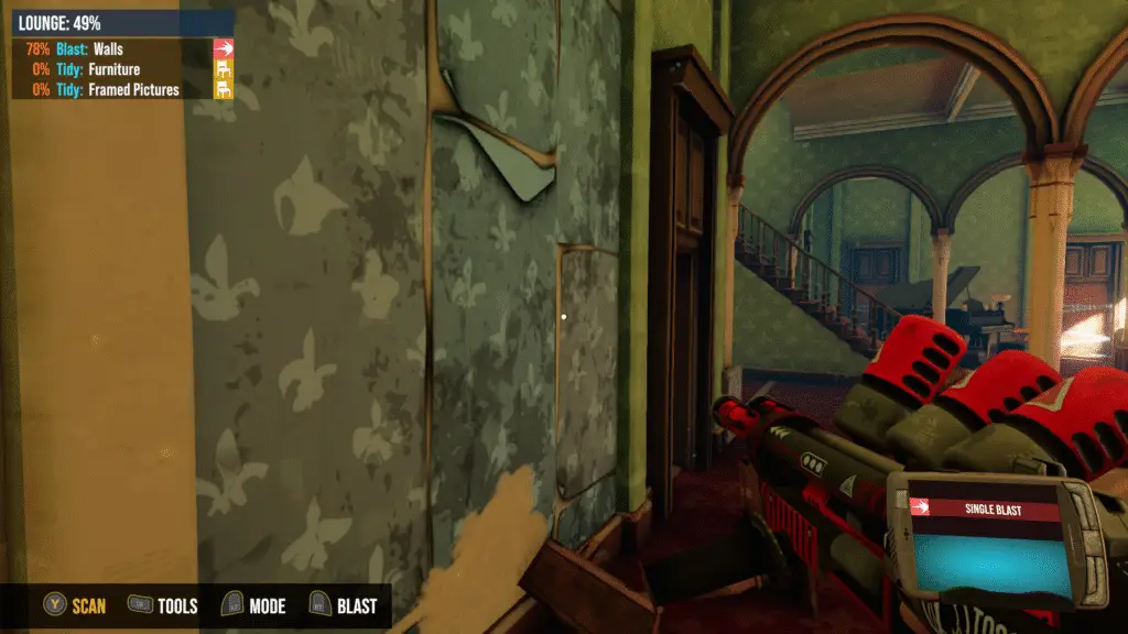 The mechanics of renovations are quite simple, choose the correct “gun”, aim, and shoot. If you are not sure what gun you need to use, you’ll want to look in the upper left corner to see what tasks need to be complete. When you open up the tools menu you’ll see the colors and icons correspond to the icons in the upper left. Once you’ve chosen a matching one, scan to see where to aim and go nuts working on your renovations! This is definitely a relaxing part of the game and those who enjoy games such as the House Flipper series or the Power Washing series will feel right at home with these mechanics.