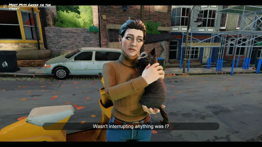 So the title is right so far, there are no ghosts at the Grand. However, the demo is quick to show you that there is more than just the Grand. Step outside to meet Miss Green who is holding the sweetest seeming cat. You can hear the cat purring in her arms ready to go on a trip. Miss Maddie Green is ready to investigate the black ooze on a nearby island and apparently she cannot do this without you. Not only does she need you to accompany her, you’ll also be driving the vespa. Careful, you’ll have precious cargo in the front of the vespa.
