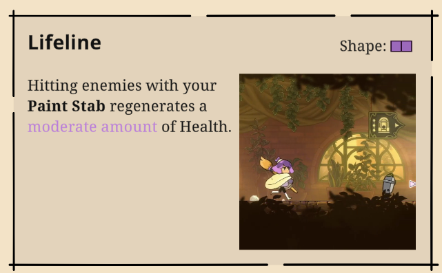 Two examples of Inspirations are Lifeline and Dark Embrace. Lifeline will generate Health back when using Paint Stab against enemies. Dark Embrace, on the other hand, will prevent damage using Paint Dive while corrupted (out of Paint) and will inflict damage to enemies when dodging.
