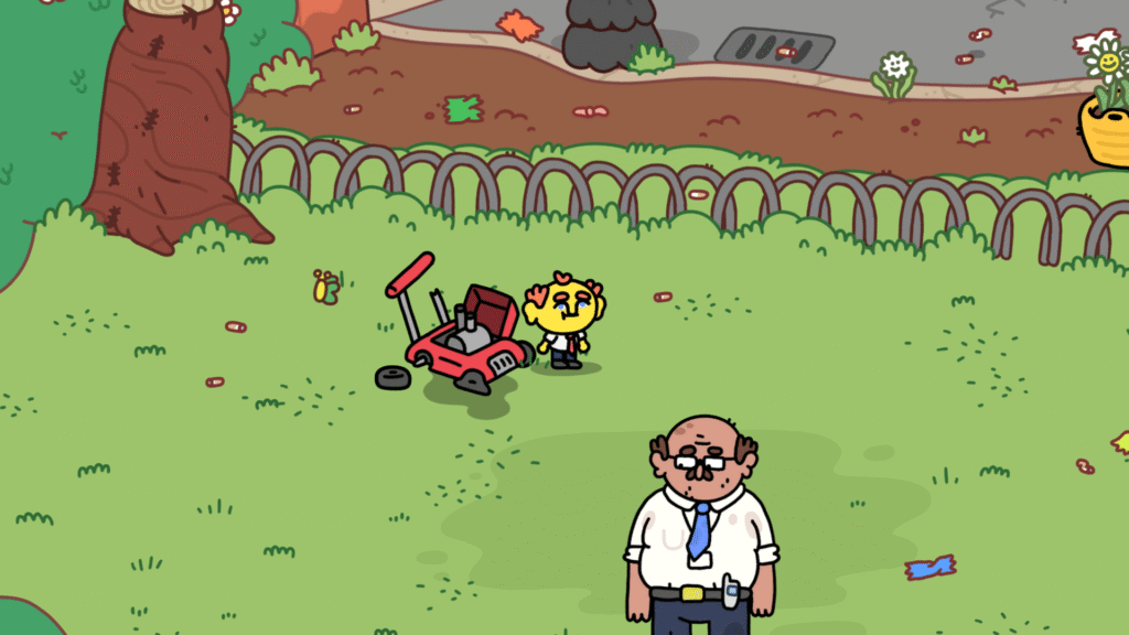 From here, head south till you see a patch of grass beyond a little fence. Hop over the fence to find this mower and press ‘punch’ on it to be flown across the screen – note the mower won’t look destroyed when you first find it.