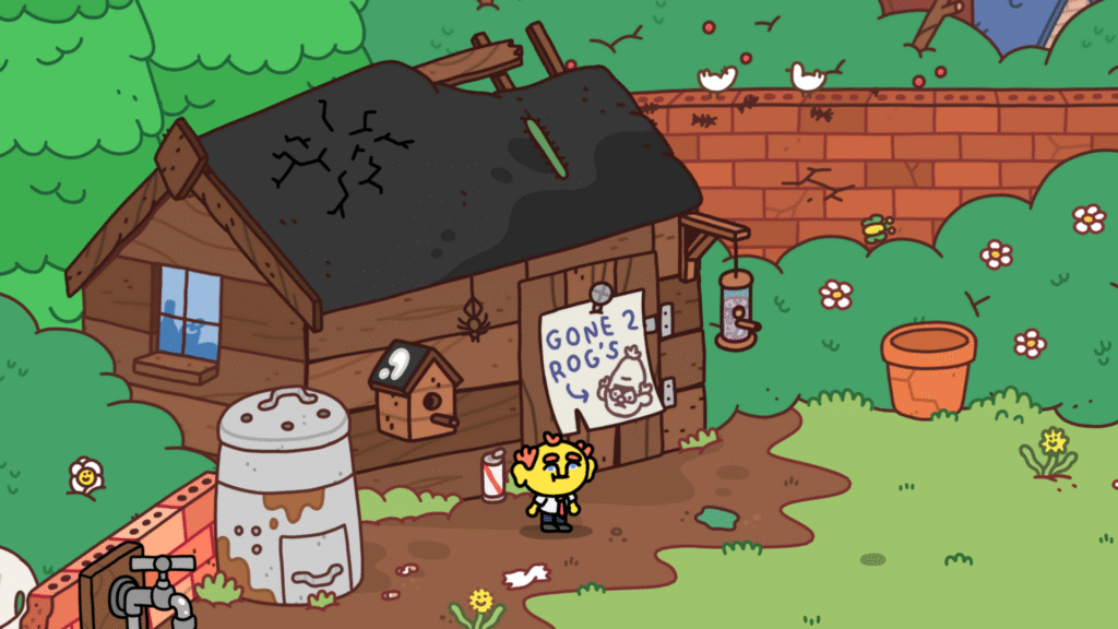 After progressing through the game for a while, you will be pushed down a chimney and end up in a man’s room making a soot-y mess, from which you can jump out the window. This leads to a garden.