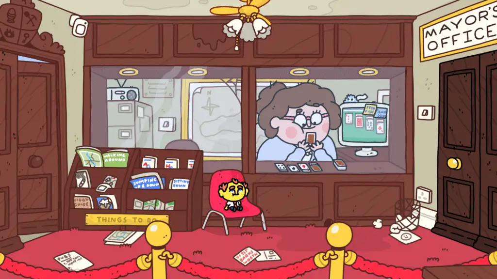 After arriving at Barnsworth, you will be in the reception waiting to see the Mayor. Normally, to play the game properly you’d leave the office through the door on the left and head into town.