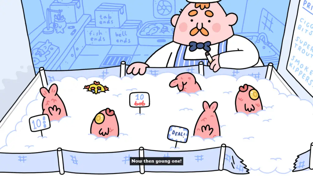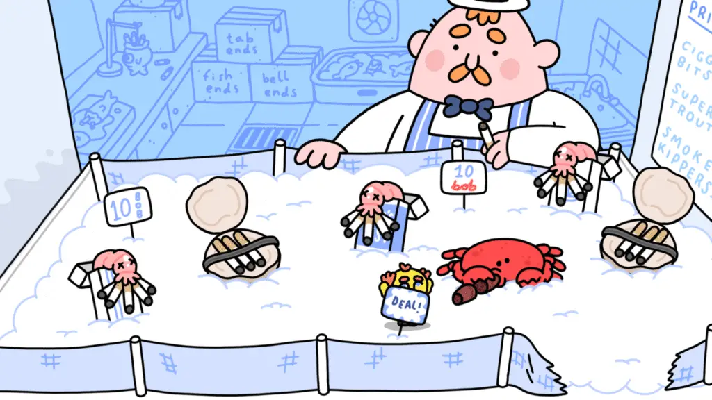 Not too long later, you’ll be passing back through the fishmongers. If you’ve done it right the first time, you’ll notice he has a range of new items including a crab on the ice tray. Once again, give everything 5 or more whacks.