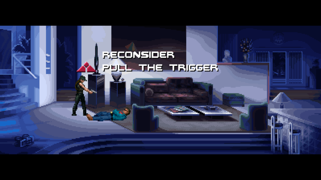 When you come to this next section, if you had chose ‘Reset the chip, you will need to choose ‘Pull the trigger’, thus killing the man as Sarah (as below). If you’d not reset the chip, The Terminator will kill the man for you automatically: