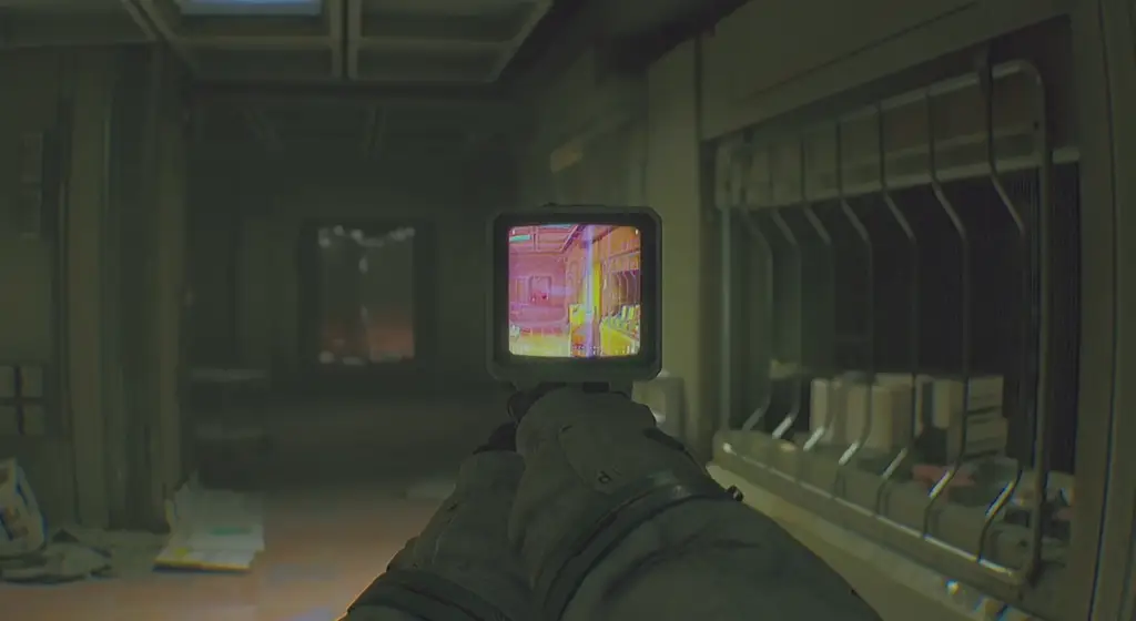 This design ethos is personified by the Cosmonaut Assistance Tool (C.A.T.), a handheld device you will soon find after arriving at the station, and your only aid in your search for what happened at the lunar base. The C.A.T. is chunky, camcorder-like, and intentionally cumbersome, a tool that demands attention and care. You must manually select and activate each module to bypass locked doors, view objects and your environment through a UV lens, or illuminate dark corridors, all while keeping an eye or ear on your surroundings.