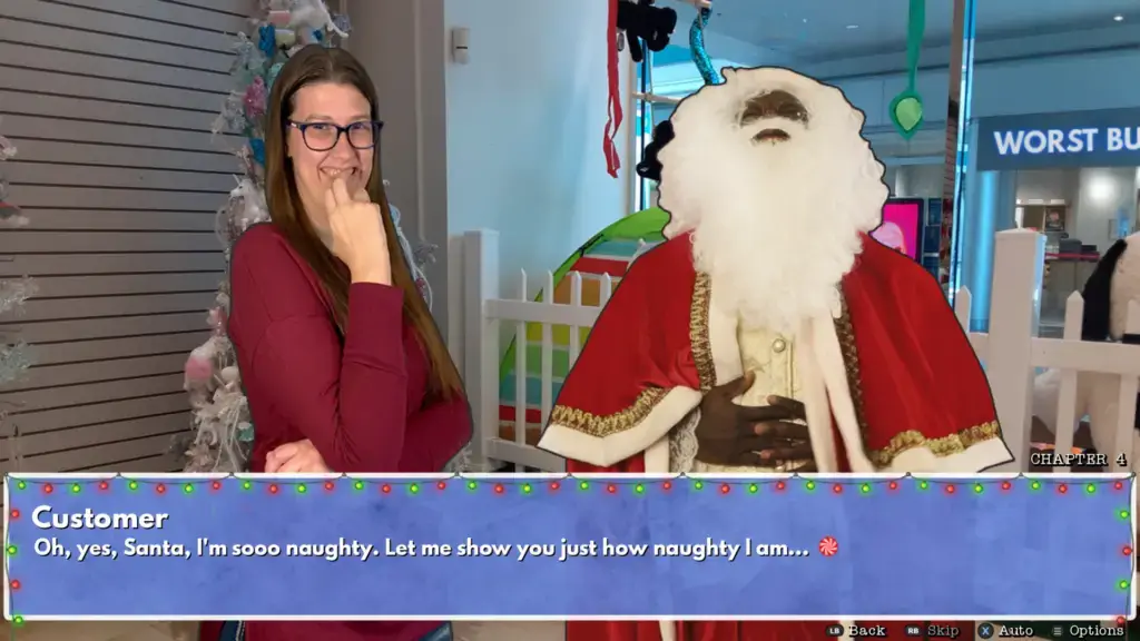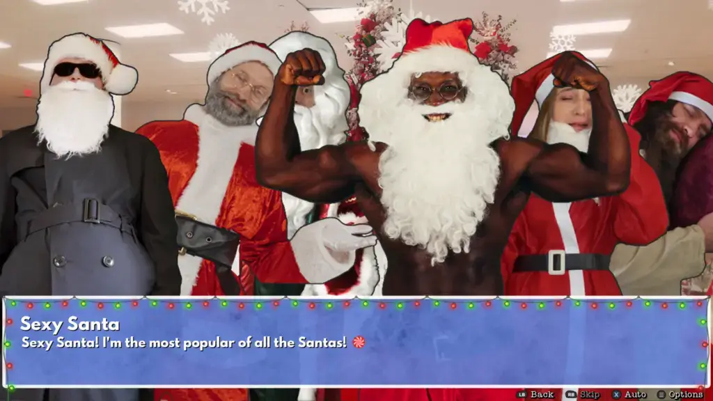 Not just looking for some business improvement, Sandy is out for some Love Actually-like seasonal romance. Sandy should strike her desire to be Mrs Claus off her wishlist as these Santas are some of the cringiest characters I’ve experienced in any storytelling medium. After playing through Too Many Santas! to several endings – both naughty and nice – the dating element is very oversold.