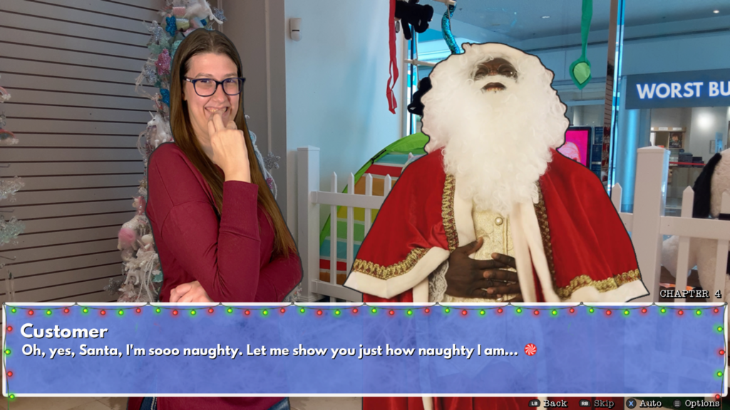 Not just looking for some business improvement, Sandy is out for some Love Actually-like seasonal romance. Sandy should strike her desire to be Mrs Claus off her wishlist as these Santas are some of the cringiest characters I’ve experienced in any storytelling medium. After playing through Too Many Santas! to several endings – both naughty and nice – the dating element is very oversold.