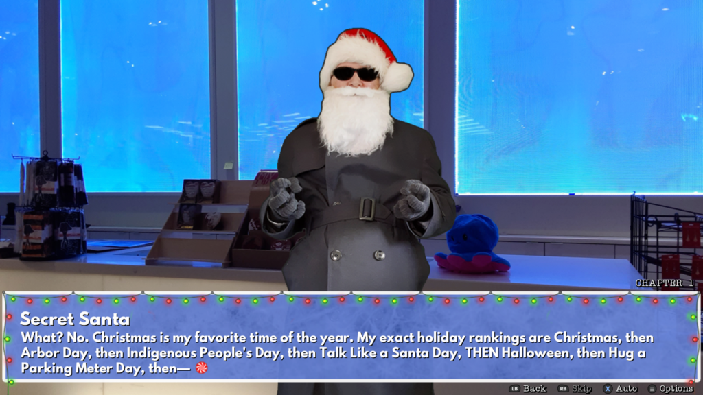 For a smaller title I wasn’t expecting a literary classic. The naughty and good endings with each Santa are very short and any character development doesn’t have the wingspan to take off before ending with a thud. Though, the underdeveloped stories are a minor complaint compared to the writing in general which is just incredibly cringe. Lines include, in response to a lady coming into the store to buy a teddy for her daughter: “Do you want your kid to be an idiot? Because that’s how you get an idiot.”. Whether Too Many Santas! is just trying far too hard to be humorous is difficult to tell. Sadly, it’s jokes and attempted sass make Christmas cracker jokes seem like A-tier comedy. Humor is indeed individual to us all and there will be some who find this a funny short story compilation. Yet, this visual novel’s comedy is so antiquated that I cannot even recommend this as something to provide a festive chuckle.