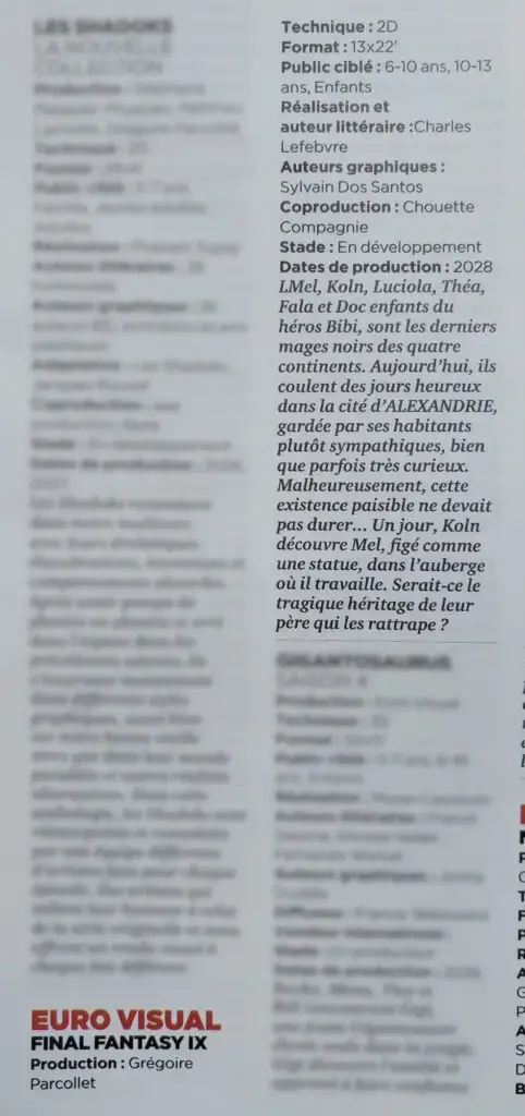 Originally reported on by news outlet RPGSite, this news was featured in the new issue of Ecran Total, a French publication that covers the business side of film and TV. Apparently, the report states that, after the closure of Cyber Group Studios, which was originally working on the Final Fantasy IX anime, the project will now be handled by Euro Visual. The relevant snippet from the article is presented below, accompanied by an English translation.
