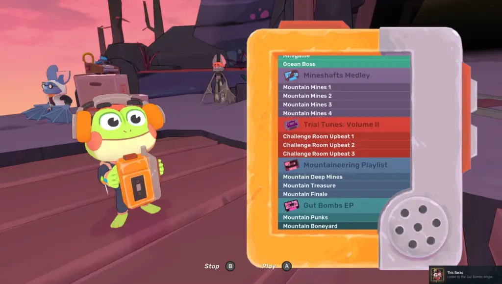 Equip it, and you can then use it to listen to any of the Cassettes you have found scattered across the game. But, at the very bottom of the playlist, you’ll find the Gut Bombs EP!