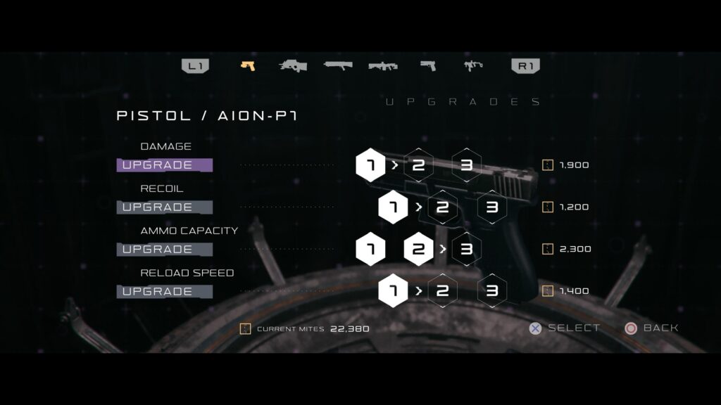 There is a special and odd thing about the Armorer console. It is literally the ONLY place to see and use the amounts Mites, the game’s currency, you’ve collected. (Note: there is a trophy associated with hoarding a total of 27,000 Mites at once). Again, if this was by design, it’s an odd one. Mites are only of use for weapon upgrading, nothing else.