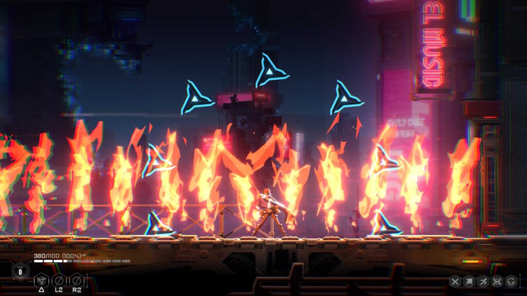 The cyberpunk aesthetic is quite satisfying as you navigate the city. While you traverse this side scroller, you’ll notice the music slowly becoming more intense as you go. The combat is also extremely smooth and satisfying to watch. There’s something about the color scheme and the stylistic attacks that just really pops off the screen. So much so that I can’t imagine how people have played this on mobile because it feels like it deserves a big screen.