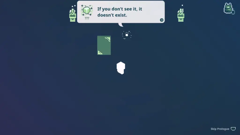 Made by solo developer Kiyoshi Honda, Cassette Boy opens with the player character, a pale square-headed figure, being visited by a shimmering cube in a dream-like void. The cube states that the moon has disappeared because we stopped looking at it, and it is up to us to gather the moon’s fragments and bring it back. It goes on to explain, using some simple examples, the first and most fundamental rule of Cassette Boy’s world: If you can’t see it, it doesn’t exist. All manner of objects and creatures can now be pulled in and out of existence, based entirely on whether we, the player, can see them on our screens.