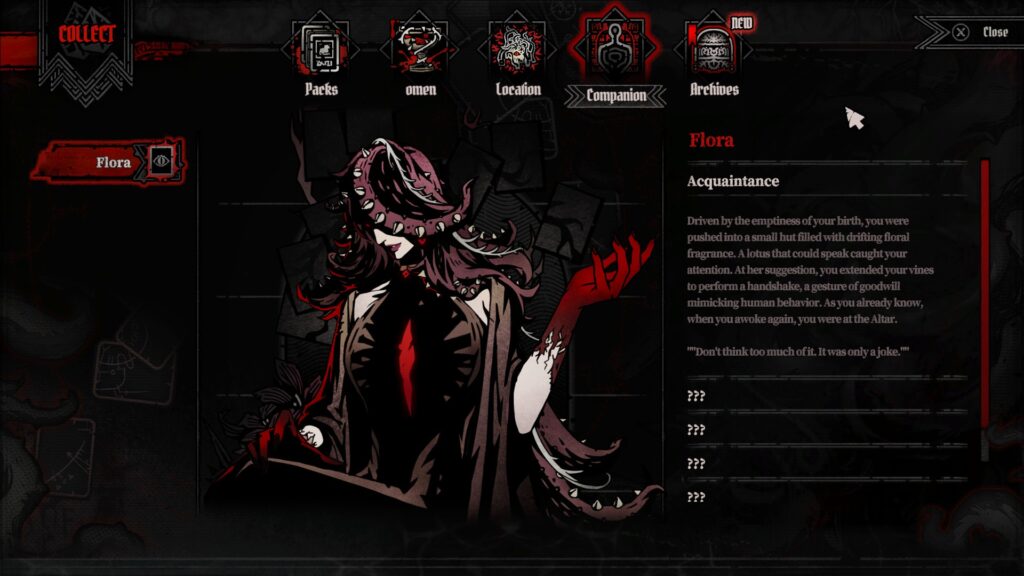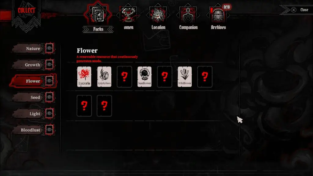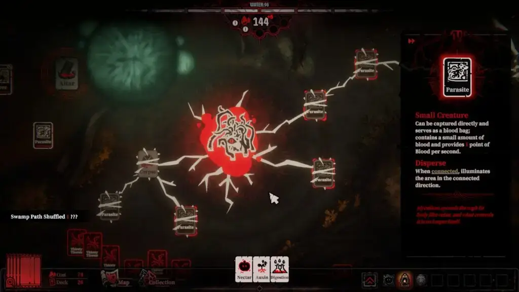 A few moments later you’ll be introduced to Flora, who transports you back to a grove where you offer your collected blood to an entity called Mother for upgrades. The upgrades unlock extra resources (blood & water), new cards for the packs you can open on runs and omens – which act as quests you can fulfill for relics and extra blood. You unlock these using the same system as the main game – spreading your roots across nodes and absorbing their traits.