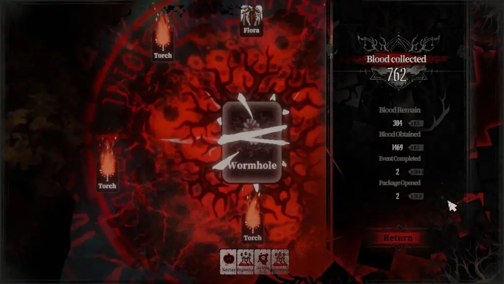 If you happen to run out of blood or water whilst decimating the unfortunate animals and unlucky humans trapped in the nightmarish world of Roots Devour, you’ll automatically return to the grove, ready to unlock some new upgrades and venture back out for the glory of the Mother.