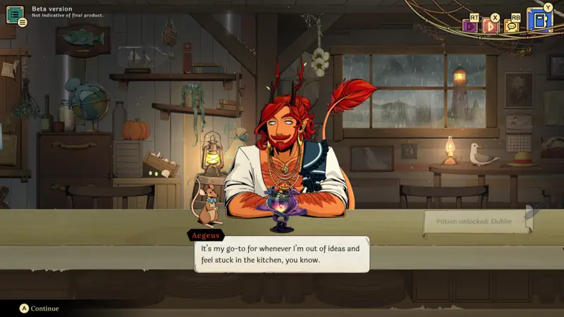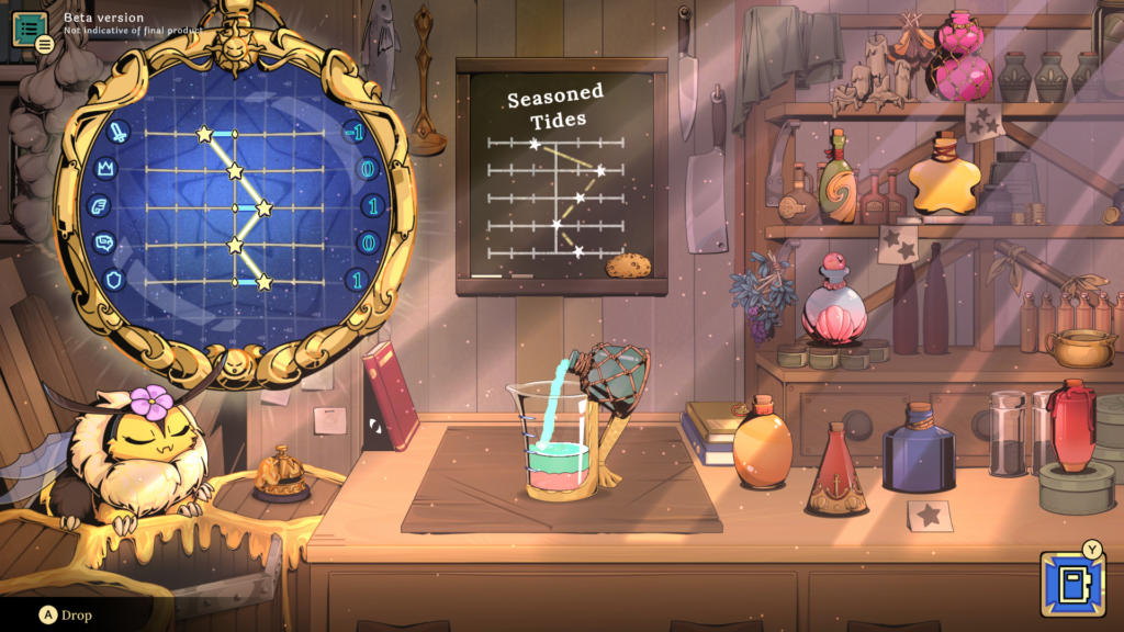 Choose from the ingredients at your disposal by seeing how they adjust the stats of the drink. Will it increase charisma and dexterity? Is this even a beverage or a potion? Perhaps a bit of both. If you don’t make the drink you intend to make, don’t worry, there is a way to start over. Your faithful companion, this lovable bee, will drink the rejects. As you pour each ingredient you’ll see the stats change in the window. Thankfully you don’t need to memorize the drink components and stats as you can draw it on the chalk board for easy reference. Once you complete the drink, Captain Beebug, your companion at the drink nook, will confirm you’ve made the drink by name. Serve it up to your customer and get back to the chatting! The mechanics here are pretty straight forward and enjoyable once you get the hang of it.